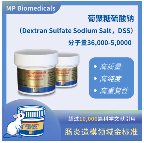 葡聚糖硫酸鈉(Dextran Sulfate Sodium Salt,DSS) 是一種聚陰離子衍生物,常用于誘導(dǎo)建立動(dòng)物潰瘍性結(jié)腸炎模型,是目前腸炎造模研究領(lǐng)域金標(biāo)準(zhǔn)。MP Biomedicals 生產(chǎn)的DSS具有高質(zhì)量、高純度、高重復(fù)性的特點(diǎn)。迄今為止,有超過(guò)10,000篇科學(xué)文獻(xiàn)引用,有效性得到了業(yè)界廣泛認(rèn)可。